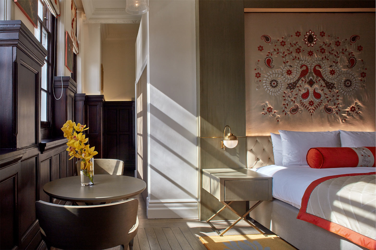 Inside the bedrooms the designers created a rangoli tapestry—reminiscent of the golden ‘Peacock Throne’—where the relief forms the bedheads in every room with applique silk tapestries made by seamstresses in Delhi. Fodor’s capture this as ‘English Heritage meets Indian opulence” where the designers have paid homage to the scholastic origins. The biggest success of the project is the planning achieved by Archer Humphryes where they revivified the urban realm into a flourishing district formerly derelict.