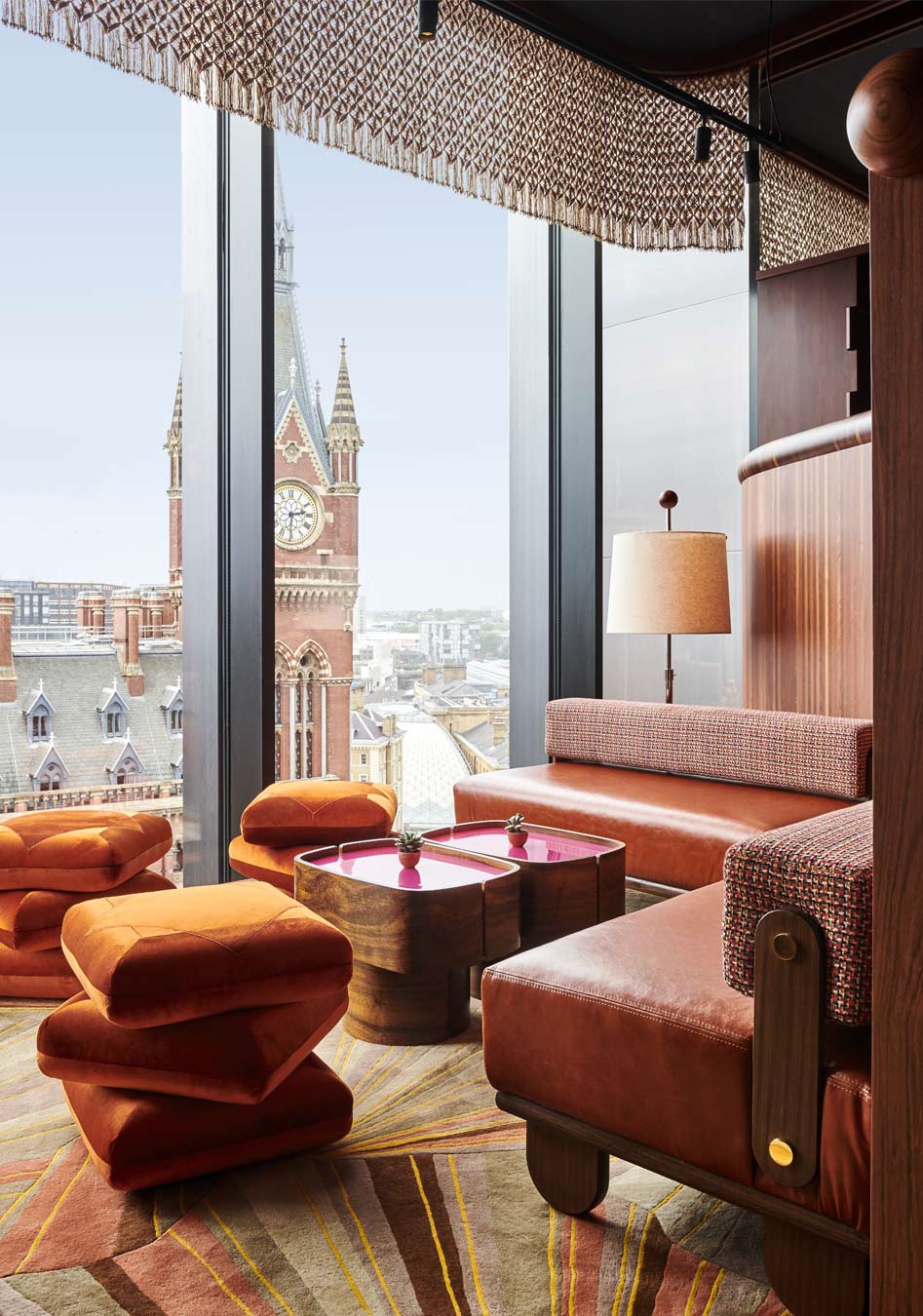 With 266 rooms (42 different styles), and sat just across from St Pancras station in King’s Cross, the eating and the drinking scene has reshaped the building into a formidable destination which Vanity Fair describes the brand as “Confident, Worldly and a little Mysterious.” Paying homage to one of the building's original uses as a public library is the library lounge, with a proper library of books in 26 different genres, carefully chosen and maintained by a local librarian, with restaurants Double Standard and Decimio a rooftop destination reached by a red bullet elevator. Architectural Brutalism has shifted from carbuncle to ‘regain their cool this century’ where Archer Humphryes previously revivified Georgian, Victorian and Edwardian building in recent years this has shifted to iconic deco and post war concrete structures including the Queen Elizabeth Hall on the Southbank, The Philips Haus in Vienna and the Gstaad Palace. In all projects, including the Standard the aim was to bring vibrancy, colour and vitality into the interior starting with the Modernist Movement with the Bauhaus at its’ core all the way through the post – war years. At one point in the process the studio was working on all three hotels at that intersection of Kings Cross: The Great Northern Hotel: St. Pancras Renaissance and The Standard – all seemingly incurious how The Standard Brands’ arrival would shape the neighbourhood. That was a moment.