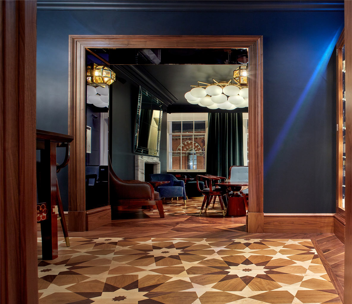 The challenge was to be the best chic bar and lounge in London. To create the concept for Anthracite Martini Lounge it required a timeless response that would blend and feel at home in the hotel. Evoking the style and glamour of the first railway age.- emphasising the historic character of the building while at the same time providing an elegant, contemporary design was the result. Starting with the entry space, the floor pattern in walnut, maple and oak was inspired by historical geometric patterns. The tessellation of stars on the floor provides a striking background that retreats in the hierarchy of the rooms, allowing other motifs- including the star sofa and bar to be prominent. When the furniture is occupied and the tables glistening with crystal and cocktails - the floor is the showcase. Interlaced with the geometry is the history of travel during the industrial revolution by train. Initially heading through the Simplon pass into Venice, then further afield to Istanbul, Syria and Iraq, Anthracite is an attempt to absorb the bygone era of the Belle Époque an overarching ambition for the hotel design concept.