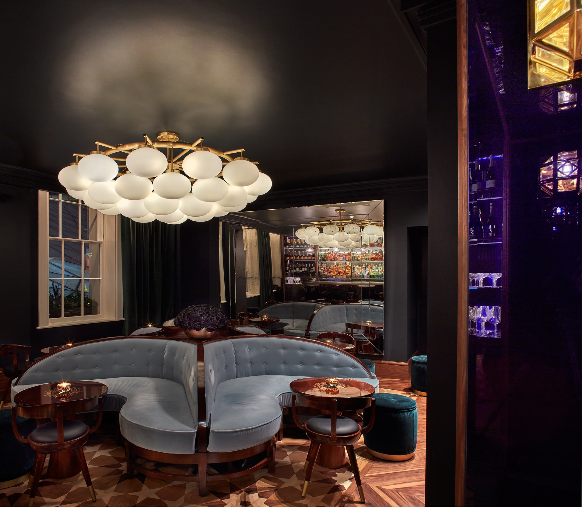 Main stand out features include: Quatrefoil high tables with marble inlay and traced brass: starfish central banquette designed in seafoam blue velvet: and opalescent Murano white spun glass chandeliers that form eye catching light to glaze over the interior.