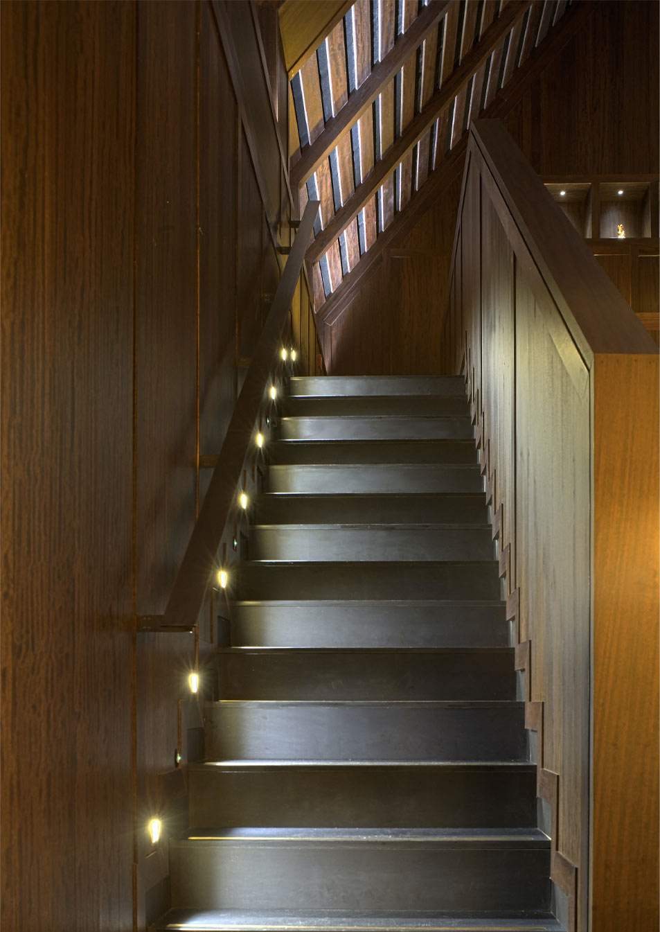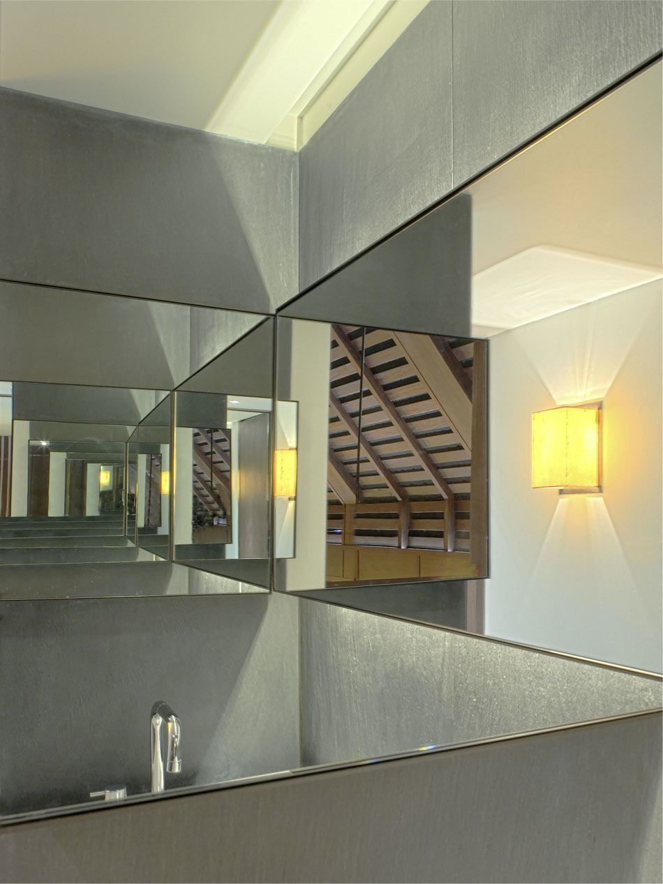 However, the character of the unit benefits from the lining of the double height volume with dark wood and deep beams, the lanterns and fans are hung from high level and agree with the layout of the teak communal dining tables. The entrance is separated by a Thai screen through which the dining hall, dramatic staircase and public balcony can all be viewed while waiting to be seated. The external areas are also developed further. The terrace dining area is surrounded with a pool containing lilies and planted with Frangipani trees, in addition to being supplied with a retractable fabric canopy and heating for diners on chilly evenings.