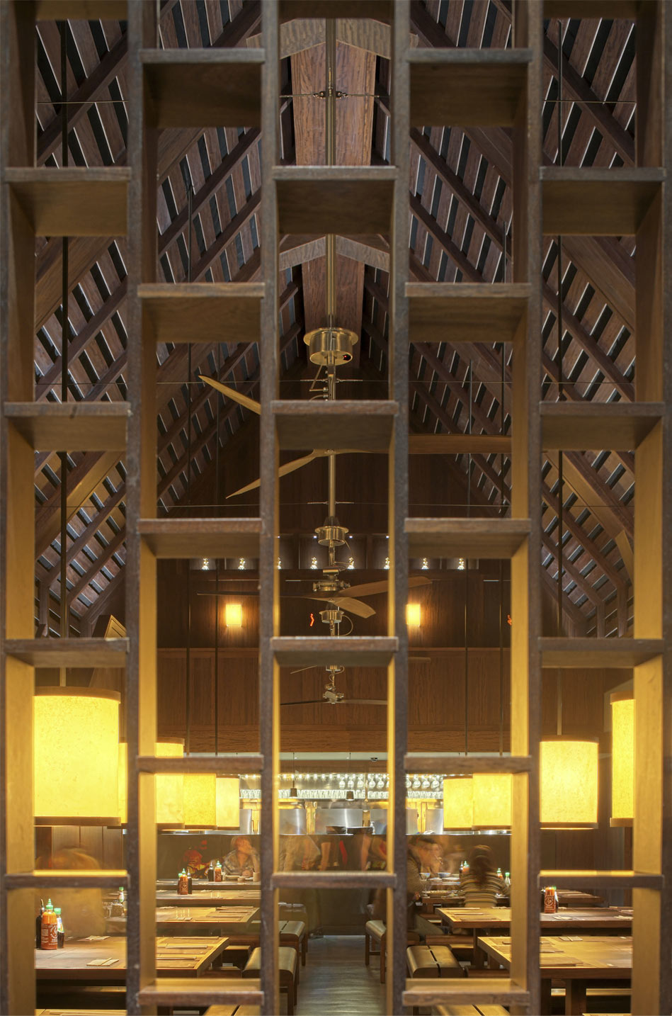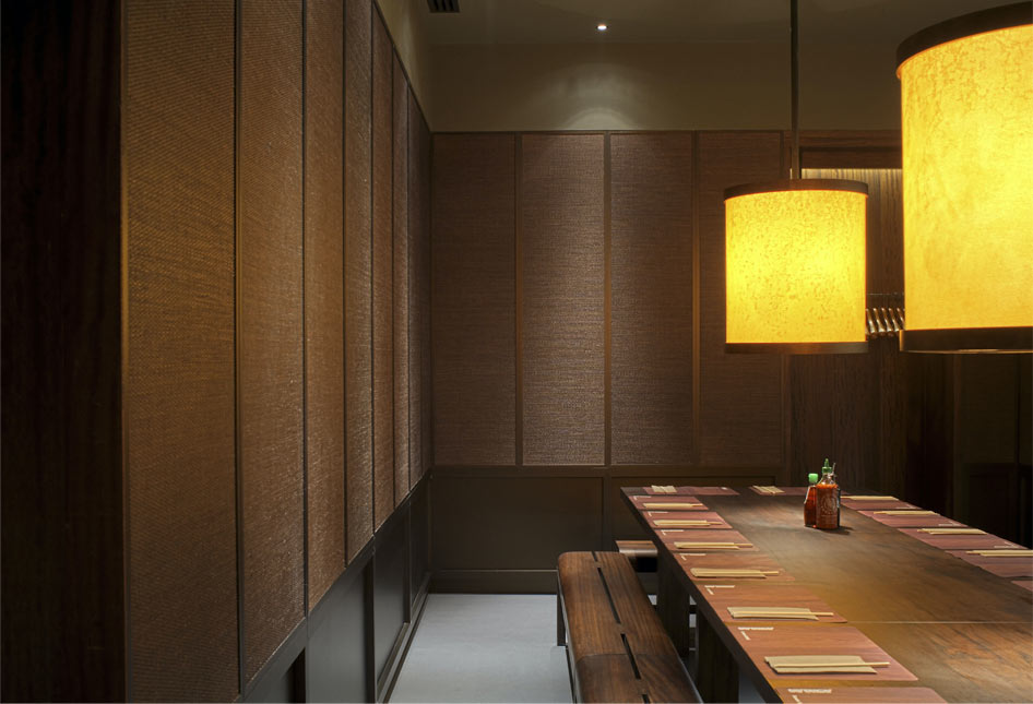 Archer Humphryes worked on the brand identity of Busaba for a decade across London with Alan Yau. Busaba Bicester – fthe first site to be outside of London was a tremendous opportunity. . This project one multiple awards and added to the practice’s accolade of Architect of the Year award in 2011. The restaurant opened in December 2010 in the Bicester Village Retail Park. The opportunity offered in this location included a space that provided 9m high ceilings and a mezzanine floor overlooking the main dining room. The approach to detailing retained the defining aspects of the earlier Busaba restaurants. Walls are lined in stained rattan with bronze panels at low level, the bars and pantries are detailed in black slate and dark colours are retained creating a warm welcoming atmosphere.